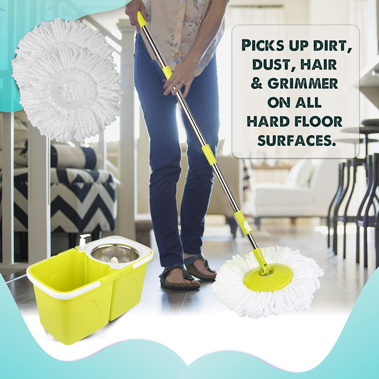 • Spin mop and bucket set has a highest quality stainless steel extensible telescopic handle with 360° rotating mop head