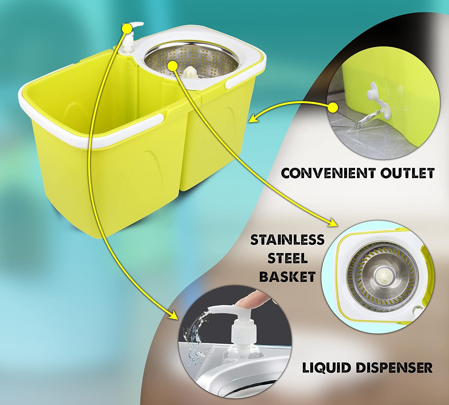 • Separates clean water from dirty water using 2 separate buckets. Integrated detergent dispenser
